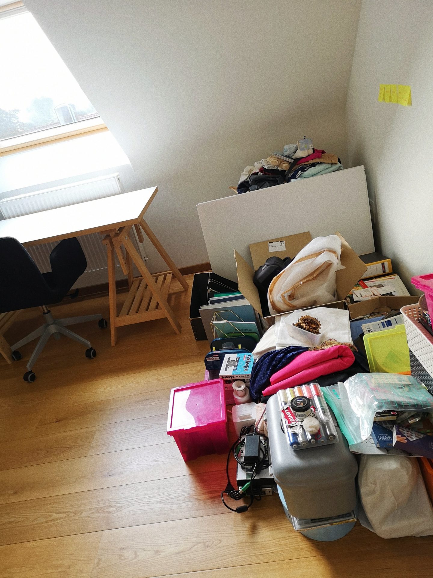 Zit ik terug (of misschien nog steeds) tussen stapels rommel. Inderdaad ๐ Alle muren staan vol met blogspullen, boeken, magazines en naaigerief. Maar ik heb een plekje en mijn bureau hou ik clean. Want zo vind ik terug een beetje rust in mijn hoofd en kan ik een klein beetje structuur in een dag bouwen (een uitdaging met een baby ๐ )